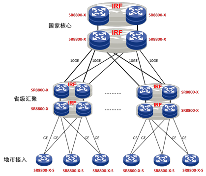 國家級廣域網(wǎng)由于地域上覆蓋的廣闊性,對網(wǎng)絡(luò)設(shè)備的可靠性和安全性要求極高,SR8800 系列可以作為國家核心和省級匯聚節(jié)點。 為了保證網(wǎng)絡(luò)的安全性,在國家核心、省級節(jié)點采用上下行設(shè)備分開的設(shè)計架構(gòu);省級和地市節(jié)點同時作為城域網(wǎng)匯聚接入、專線 匯聚、窄帶接入。