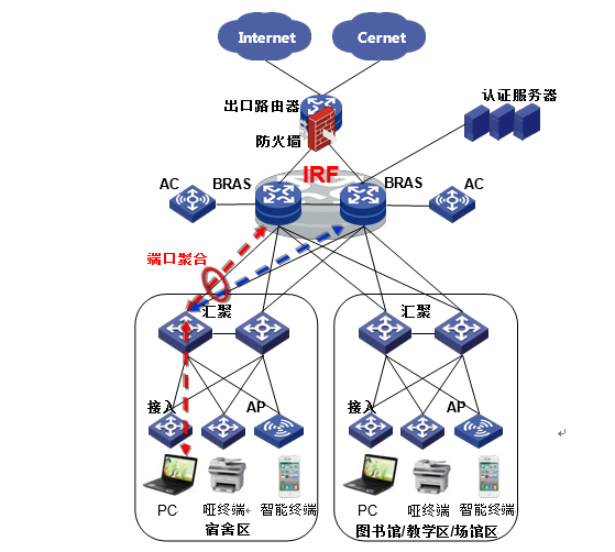 H3C BRAS 支持 iTA(智能靶向計費),通過訪問的目的地址來區(qū)分不同的業(yè)務(wù)流量,提供不同的帶寬、計費、Qos 策略等,滿足 高校用戶對訪問校內(nèi)網(wǎng)、Cernet、Internet 等不同速率不同計費策略要求;提供有線無線統(tǒng)一認(rèn)證解決方案,通過大容量 BRAS 滿 足海量用戶終端接入需求,滿足無線終端的移動性需求;BRAS IRF 功能在滿足冗余熱備的基礎(chǔ)上可以簡化運維工作。